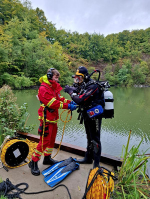 Am Sonntag, den 05. Oktober, übten die Einsatztaucher der DLRG Westerburg e.V. im Basaltsteinbruch bei Girkenroth. Bei bestem Regen und kühlen Außentemperaturen zog es die Taucher wieder in das 14 Grad warme Nass, wo sie die Suche unter Wasser bei Sichtweiten von teilweise wenigen Zentimetern übten. Ein Dank der Westerburger DLRG geht an den ASV Weroth-Girkenroth, der die Nutzung des Steinbruchs ermöglichte.